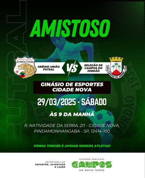 O Governo de Campos do Jordão informa que, neste sábado, 29 de março, a Seleção Jordanense de Futsal participará de um amistoso contra o time do Grêmio União Futsal. A partida será realizada às 9h da manhã, no Ginásio de Esportes Armando Ladeira, localizado na Rua Natividade da Serra, 211 – Cidade Nova, em Pindamonhangaba (SP).